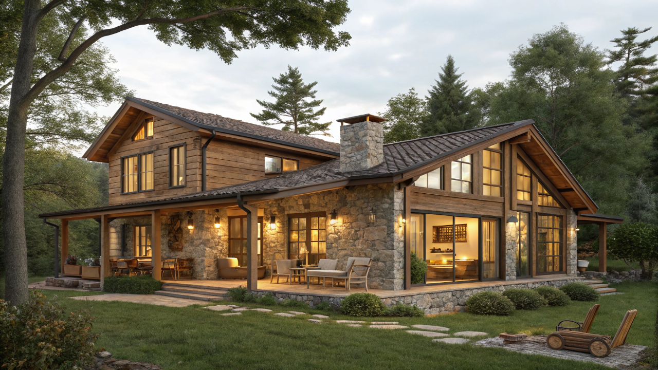 O estilo rústico-moderno da residência une elementos clássicos, como madeira e pedra, a linhas contemporâneas e iluminação estratégica. Essa combinação proporciona aconchego sem abrir mão de sofisticação, além de ser adaptável a diferentes paisagens, seja campo, montanha ou região rural.
