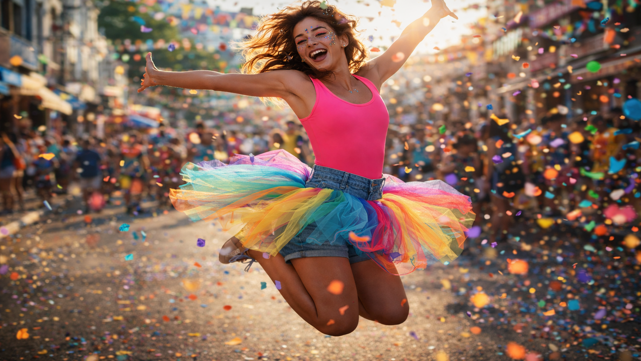 A Saia de Tule Simples, encontrada em lojas de festa por uns R$ 25, joga uma cor vibrante por cima do básico sem pesar no bolso. É um acessório barato que muda a cara da roupa e deixa tudo com ar de carnaval em questão de segundos.