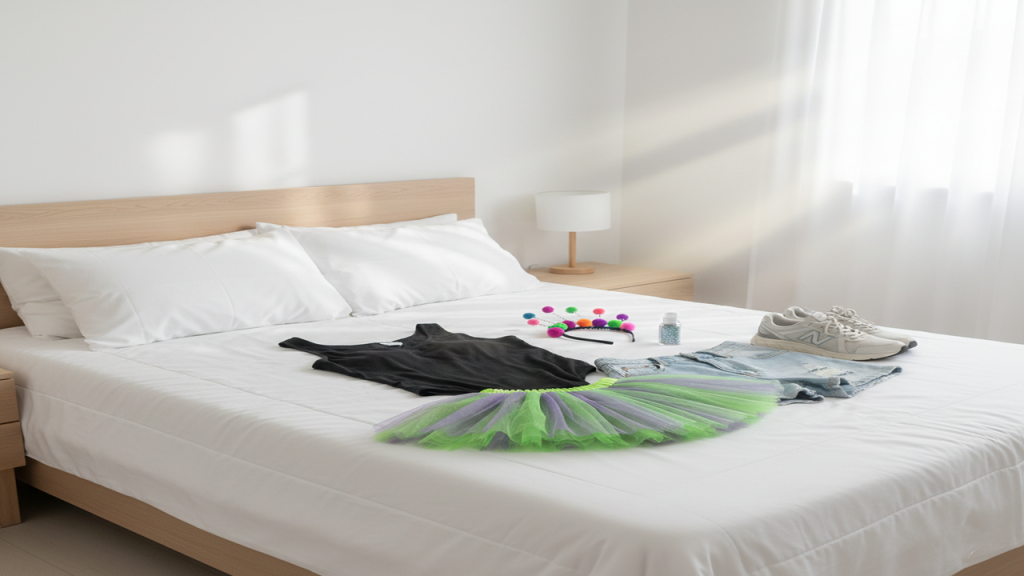 Lojas de departamento como a C&A e a Marisa costumam ter estoques grandes dessas peças básicas, principalmente perto de feriados. Já a saia de tule é fácil de achar em qualquer comércio popular de rua ou lojas de artigos para festas no seu bairro.