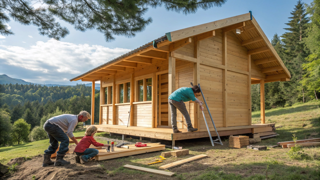 O processo começa com fundação nivelada, seguida da montagem da estrutura de madeira e instalação de paredes pré-fabricadas. Em seguida, realiza-se o fechamento do telhado, janelas, portas e acabamentos rápidos.