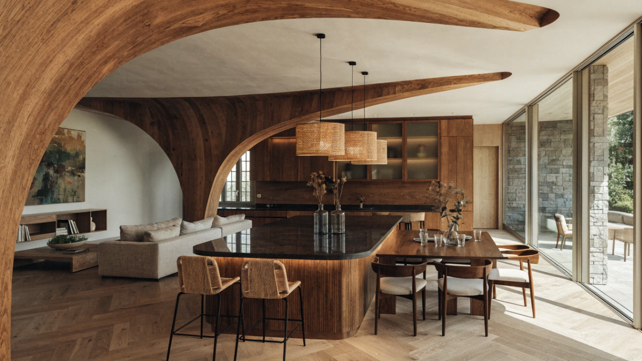 O projeto se destaca pelo pé-direito alto, estrutura de madeira aparente e estilo contemporâneo com elementos acolhedores. A área social ampla e integrada conecta estar, jantar e cozinha ao exterior, promovendo interação e aproveitamento máximo da luz natural.