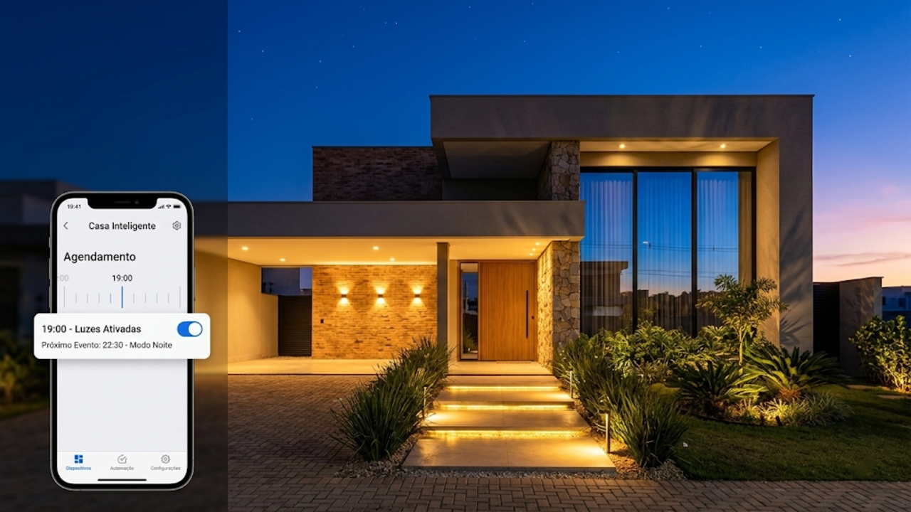 O grande diferencial dessa peça é a chance de programar as luzes da varanda para acenderem sozinhas logo ao anoitecer. Você viaja tranquilo sabendo que a fachada da casa vai ficar clara nos horários que você agendou pelo celular.