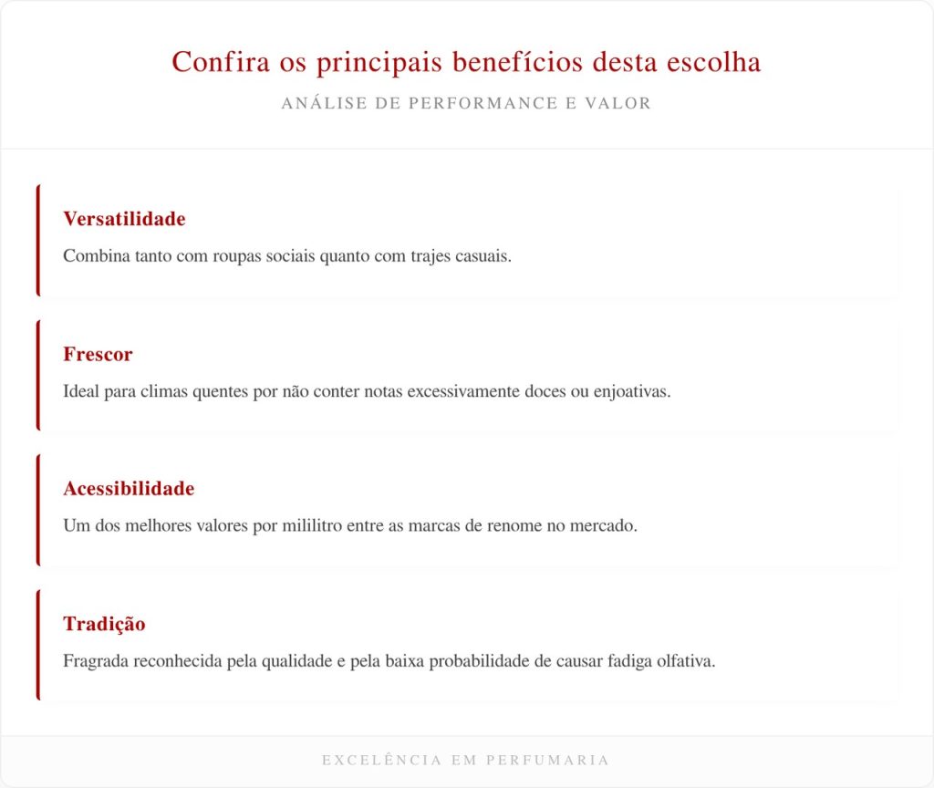 É uma opção segura para dias de reuniões intensas onde o estresse pode ser elevado. Analise a lista a seguir para entender os pontos fortes desse aroma que atravessa gerações de consumidores que buscam frescor imediato: