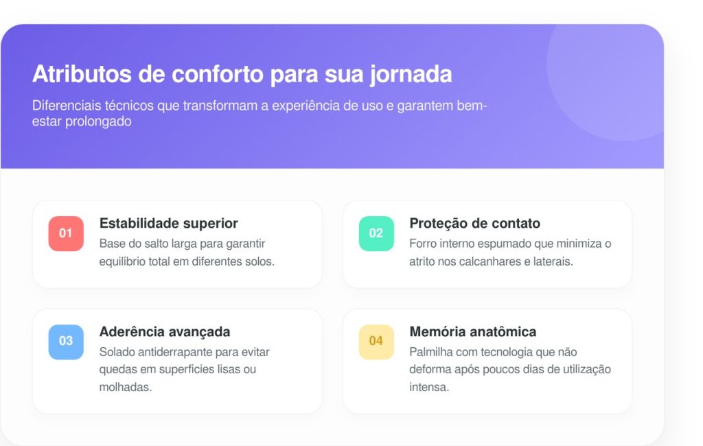 A área de contato maior com o solo reduz a oscilação do tornozelo, prevenindo torções comuns em saltos finos. Além disso, a segurança gerada pelo salto bloco diminui a tensão muscular nas panturrilhas. É a escolha inteligente para quem precisa de agilidade no dia a dia.