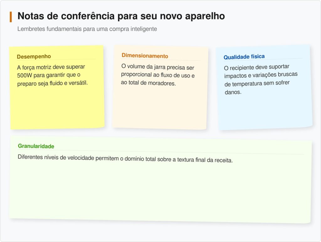 Ter um motor robusto permite lidar com ingredientes densos sem risco de superaquecimento constante do sistema. Equipamentos com mais de 700W de potência processam grãos e gelo com facilidade, garantindo maior longevidade ao aparelho. Isso reduz o tempo gasto e permite focar na criatividade culinária.