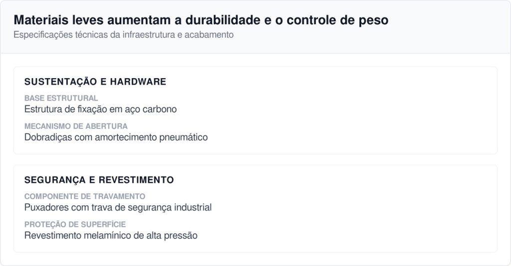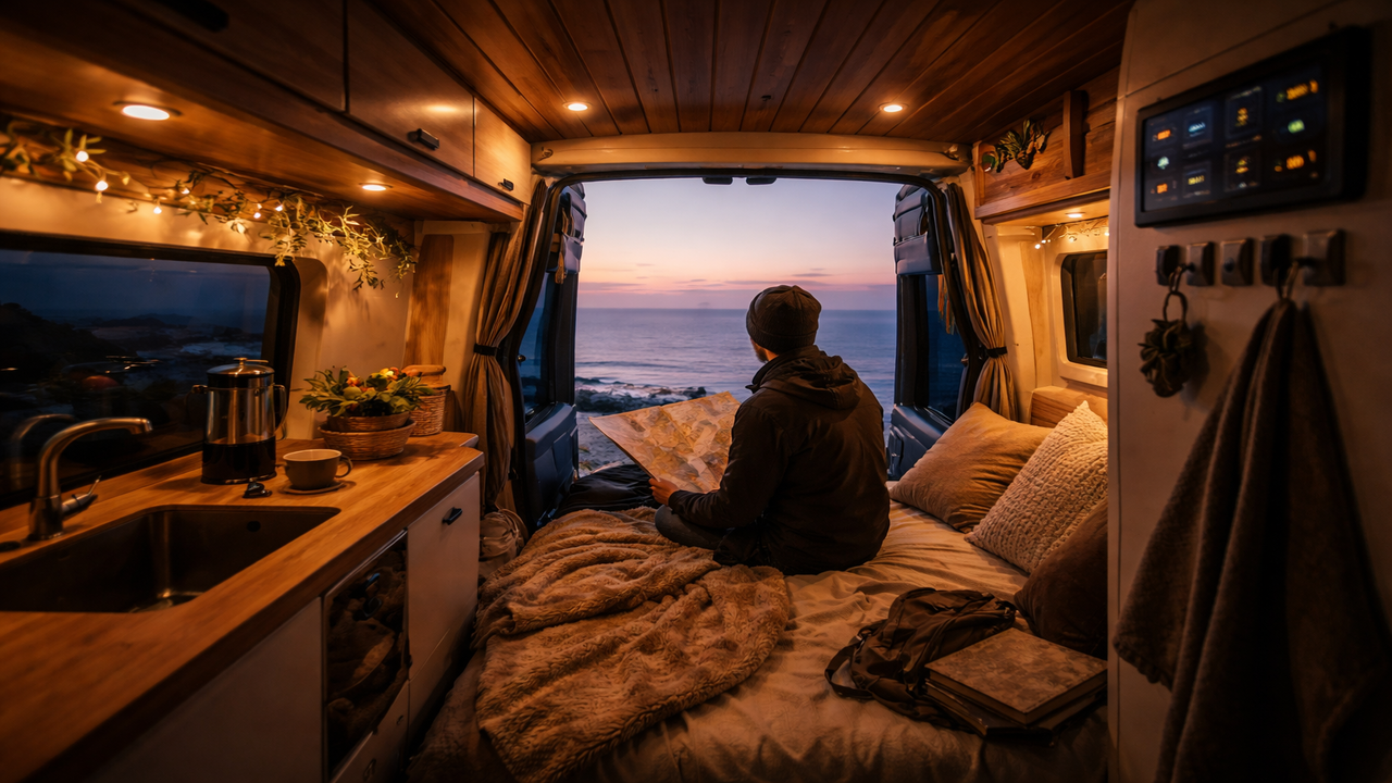 A marcenaria consome cerca de 30% do orçamento total. O uso de Compensado Naval é obrigatório para resistir à umidade e às vibrações do deslocamento. Um projeto básico para vans médias custa em torno de R$ 15.000, incluindo armários, cama e bancadas resistentes.