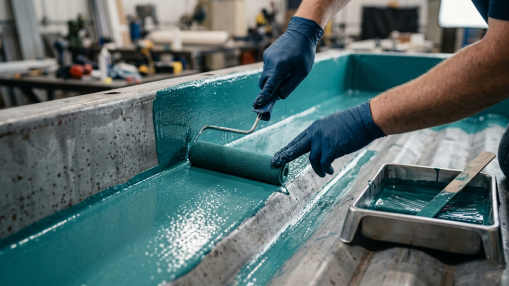 Outra alternativa premium envolve revestir o interior com fibra de vidro moldada diretamente sobre as chapas corrugadas. Esse acabamento cria uma barreira perfeitamente lisa que facilita a limpeza diária e elimina totalmente o risco de perfurações microscópicas na estrutura primária.