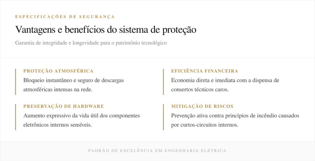 Para garantir essa defesa elétrica contínua, um protetor individual certificado pelo Inmetro custa de R$ 45 a R$ 80. Observe os impactos diretos desse filtro na economia doméstica: