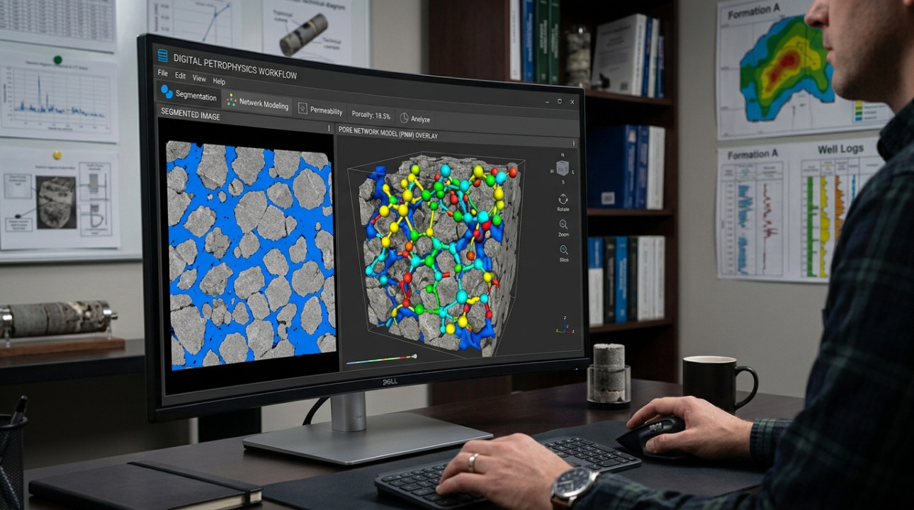 A petrofísica digital converte imagens de rocha em modelos numéricos capazes de estimar propriedades sem depender apenas de ensaios laboratoriais convencionais. Na prática, a segmentação dos poros e minerais permite medir distribuição de tamanhos, conectividade e caminhos preferenciais de escoamento.