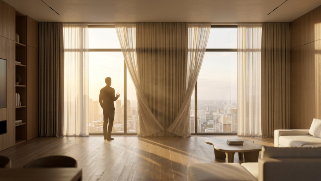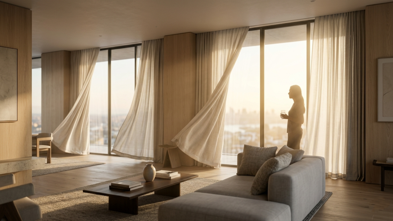 O controle passivo de luz regula a temperatura interna sem a necessidade de ligar o ar-condicionado. Durante o verão, as cortinas se fecham automaticamente nos horários de maior incidência solar, bloqueando o calor excessivo e preservando a integridade de pisos de madeira e tapetes.