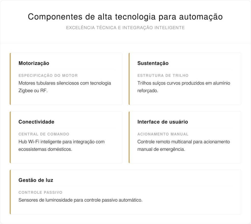 Motores tubulares de alta performance operam com ruído reduzido, geralmente abaixo de 35 decibéis. Marcas como Somfy e Zemismart oferecem modelos que ficam ocultos dentro do tubo da cortina, preservando a estética sofisticada do ambiente sem fiação aparente.