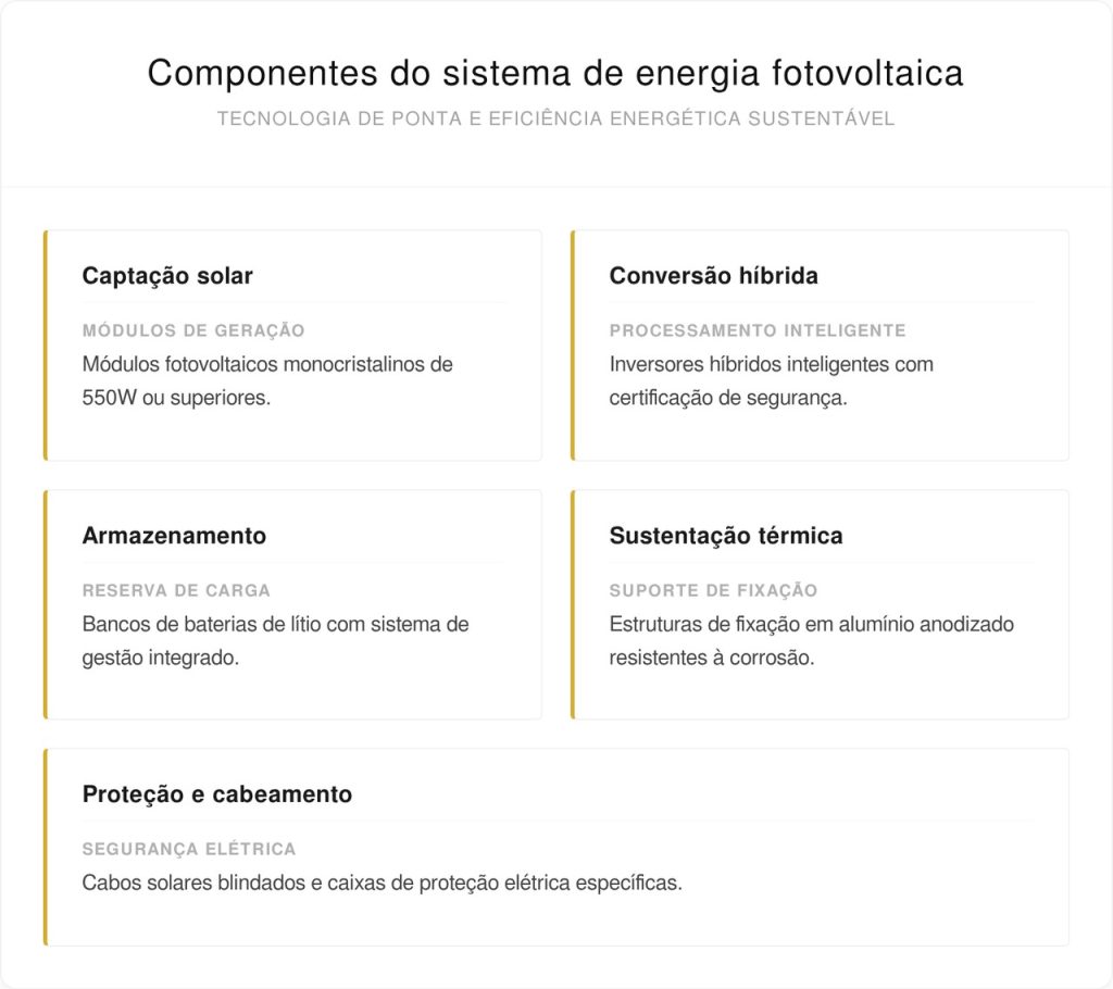 As baterias de lítio são o componente mais oneroso do projeto, com valores que variam entre R$ 20.000,00 e R$ 50.000,00. Elas superam as tecnologias antigas por apresentarem maior densidade energética e uma vida útil que ultrapassa 10 anos de uso contínuo.
