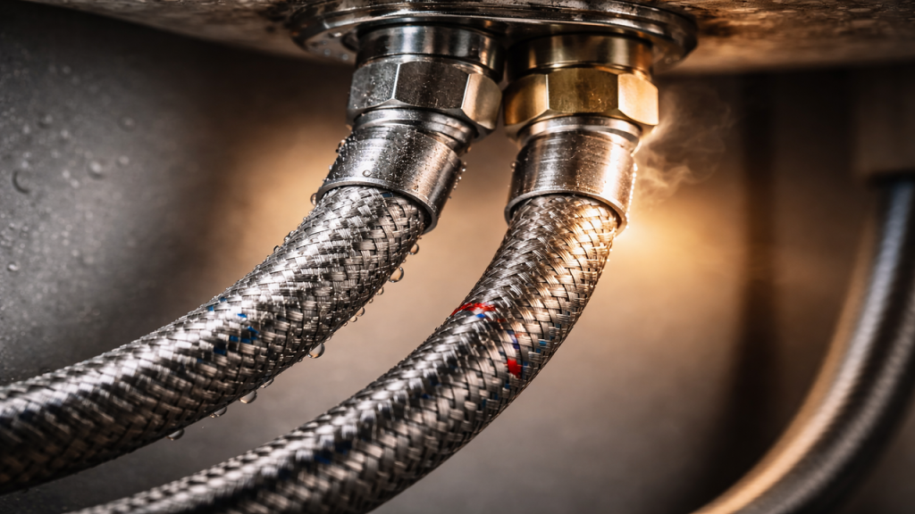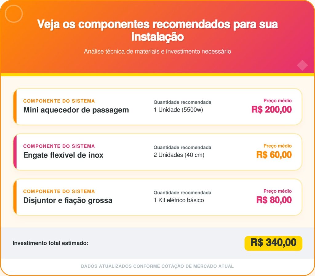 O engate flexível trançado em aço inoxidável é a peça responsável por conectar a saída do aquecedor até a base da torneira principal. Um par dessas mangueiras metálicas de 40 centímetros custa cerca de R$ 60 e suporta enormes variações térmicas sem apresentar vazamentos ou dilatações estruturais.