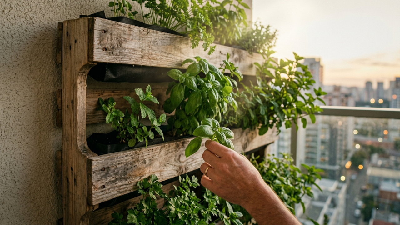 Montar uma horta vertical suspensa em pequenos espaços é uma solução inteligente para quem busca temperos orgânicos sem gastar muito dinheiro. O reaproveitamento de estruturas de madeira aliado a insumos básicos garante um jardim produtivo na parede da sua varanda urbana.