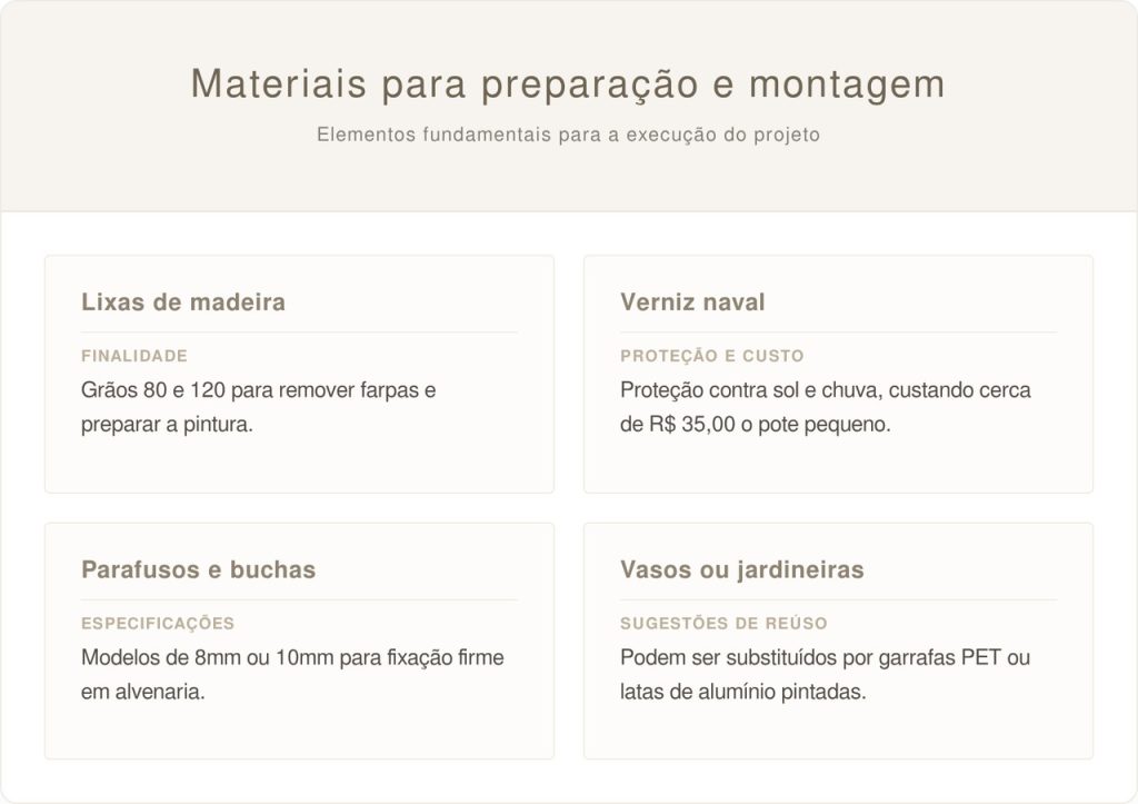 Além dos materiais principais, pequenos acessórios de fixação são necessários para garantir que a montagem suporte o peso da terra úmida. O planejamento financeiro deve incluir parafusos robustos e mãos-francesas de metal para evitar acidentes graves durante ventanias ou chuvas fortes.