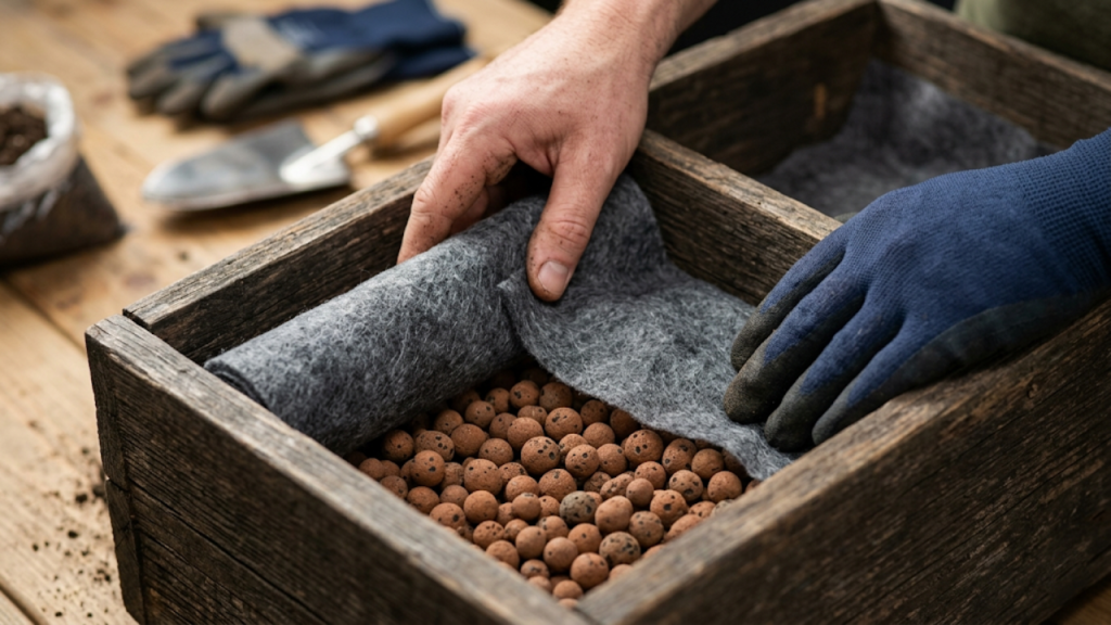 A manta de drenagem, também chamada de feltro geotêxtil, impede que a terra escape pelos furos e entupa as saídas de água. O metro linear desse material custa aproximadamente R$ 12,00 em lojas de jardinagem, sendo suficiente para revestir diversos canteiros pequenos.
