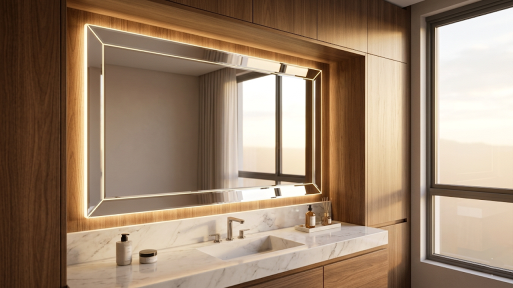 O espelho de banheiro desembaçador é uma solução tecnológica que elimina o incômodo da condensação de água após banhos quentes. O sistema utiliza uma película térmica instalada na parte traseira do vidro, mantendo a superfície seca e nítida para o uso imediato.