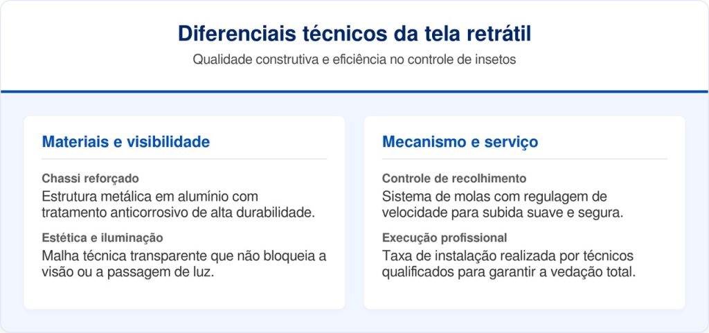 O sistema opera através de uma mola de pressão interna protegida por um perfil de alumínio extrudado. Ao soltar as travas inferiores, a tela desliza suavemente por trilhos laterais equipados com escovas de vedação. Isso evita que o vento forte empurre a malha para fora das guias.