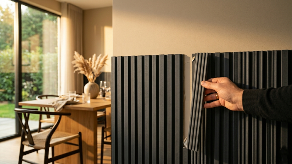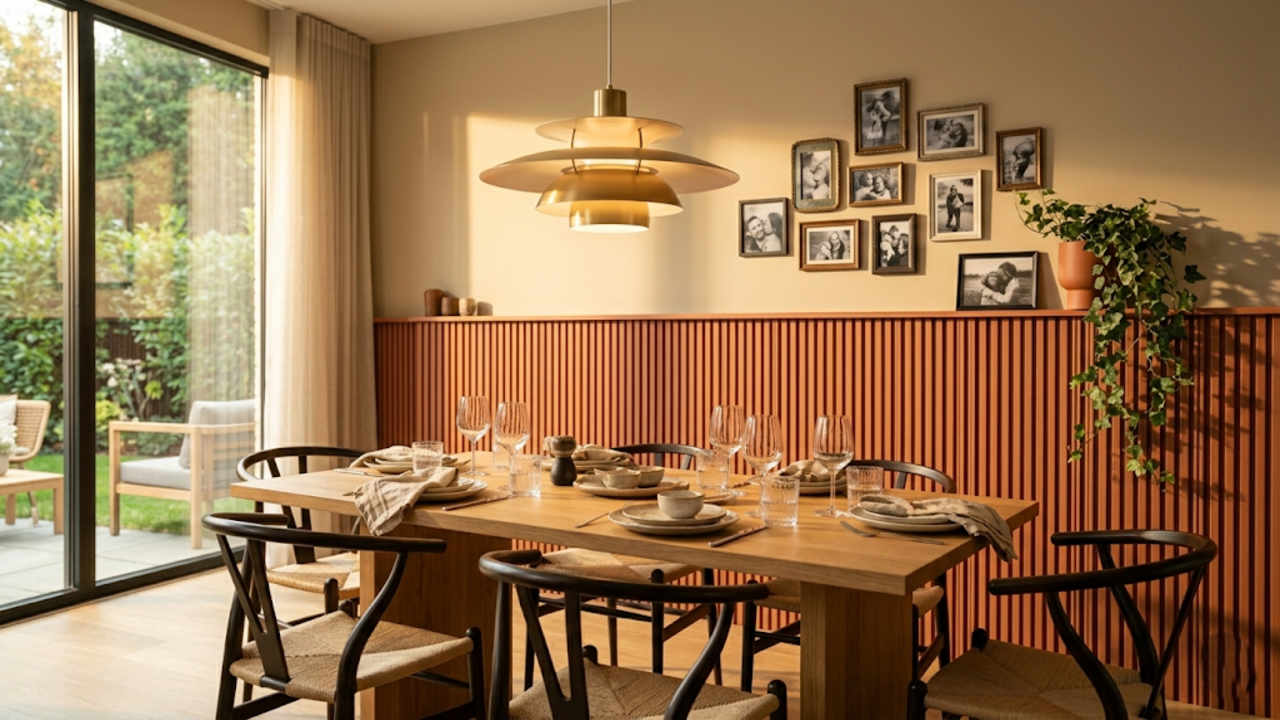 Fazer um painel ripado meia-parede de EVA delimita a sua sala de jantar sem perder espaço útil ou causar sujeira pesada. Esse projeto prático transforma o ambiente rapidamente, trazendo texturas inovadoras, cores marcantes e um toque afetuoso de decoração.