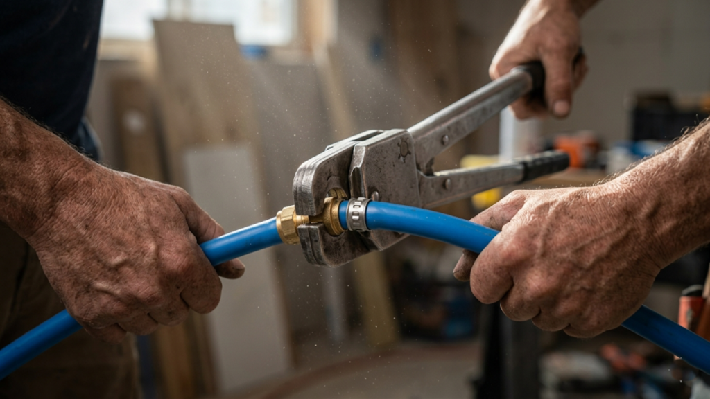 A montagem suspende completamente o uso de colas químicas nocivas e roscas plásticas frágeis. O profissional manipula um alicate de crimpagem potente que esmaga os anéis de latão metálico nas pontas dos canos em frações de segundo.