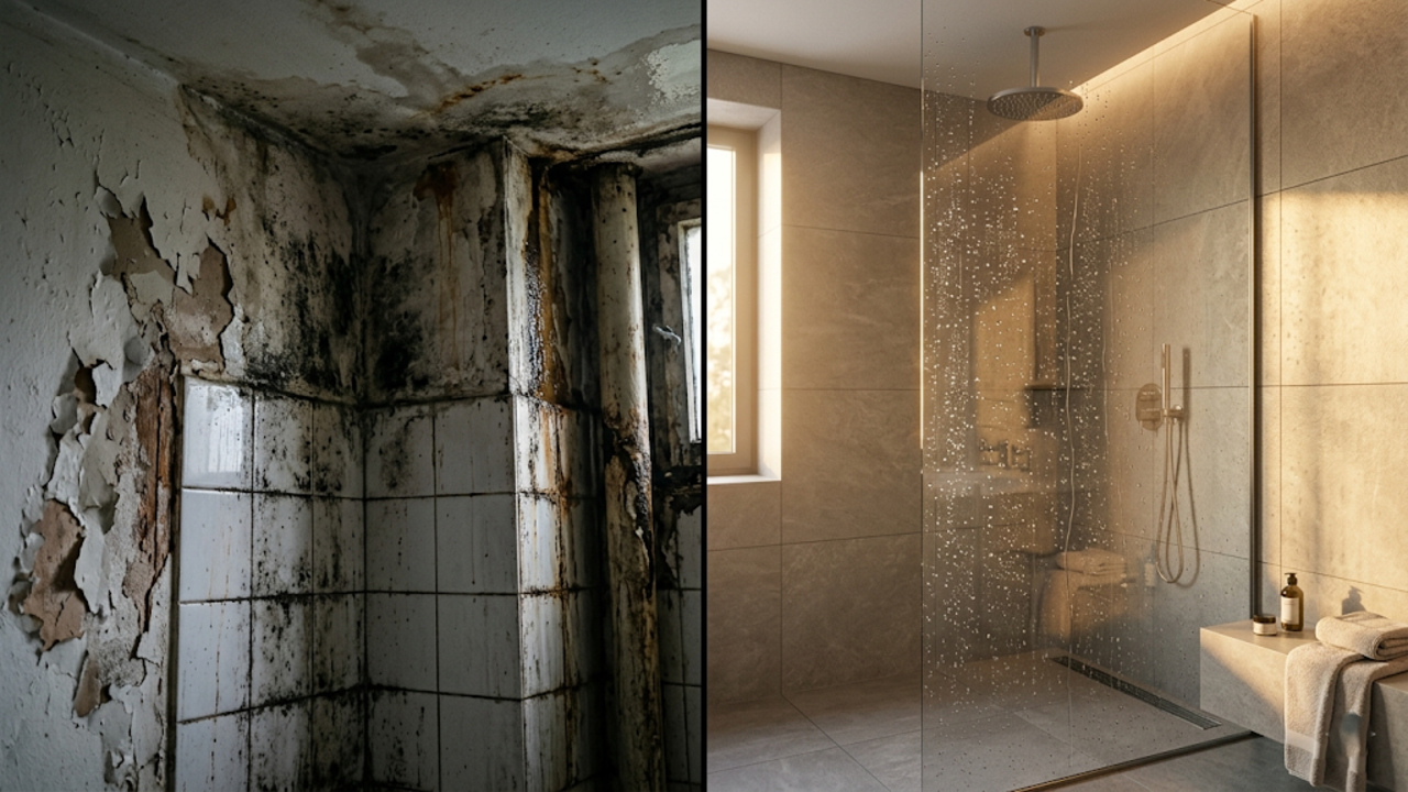 A falha na vedação original permite que a água de uso diário atravesse os desgastes do rejunte e atinja diretamente a laje estrutural. Esse acúmulo gera umidade excessiva nas paredes adjacentes, descascando a pintura e causando manchas escuras persistentes.