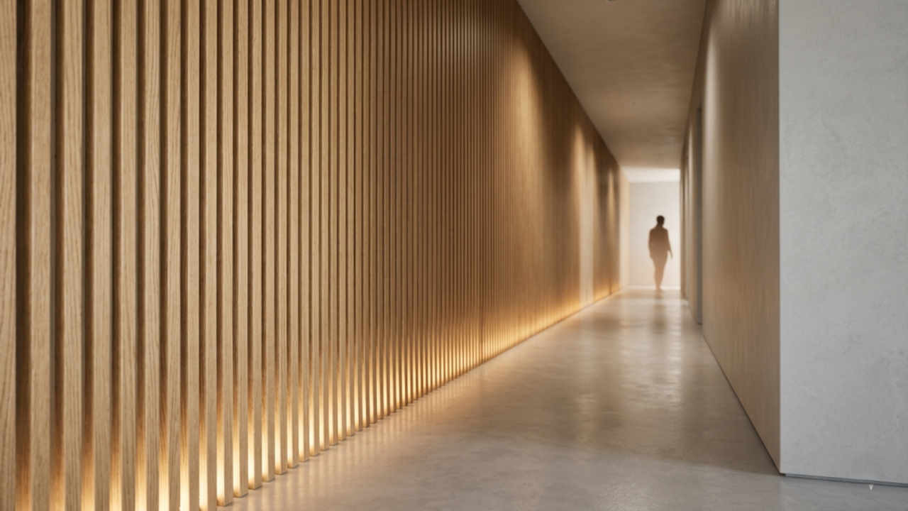 O painel ripado de poliestireno representa uma evolução prática na marcenaria contemporânea por ser leve e resistente. Sua aplicação no corredor cria uma textura linear que alonga o ambiente e suporta a instalação de luzes embutidas.