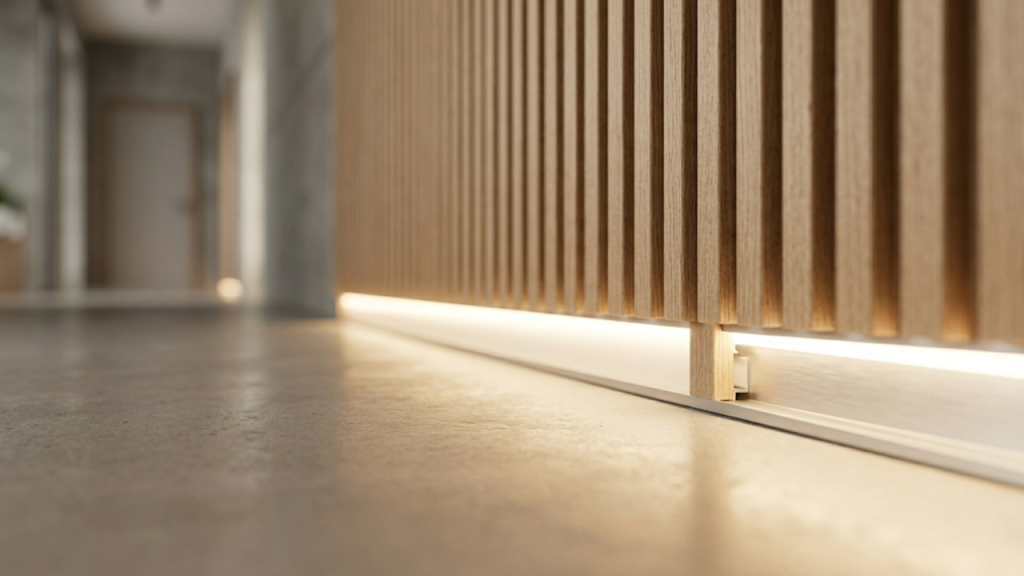 A iluminação de balizamento exige que o rodapé possua um recuo ou canaleta específica para esconder os pontos de luz. O uso de mangueiras de LED de 12V ou 24V proporciona uma luz suave que não ofusca a visão.