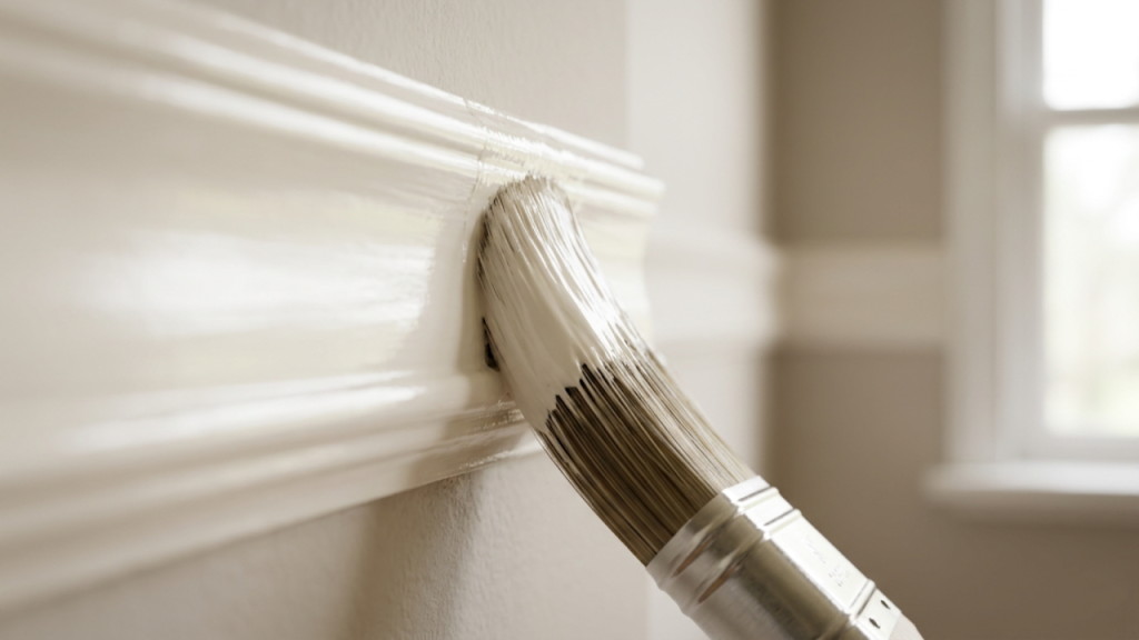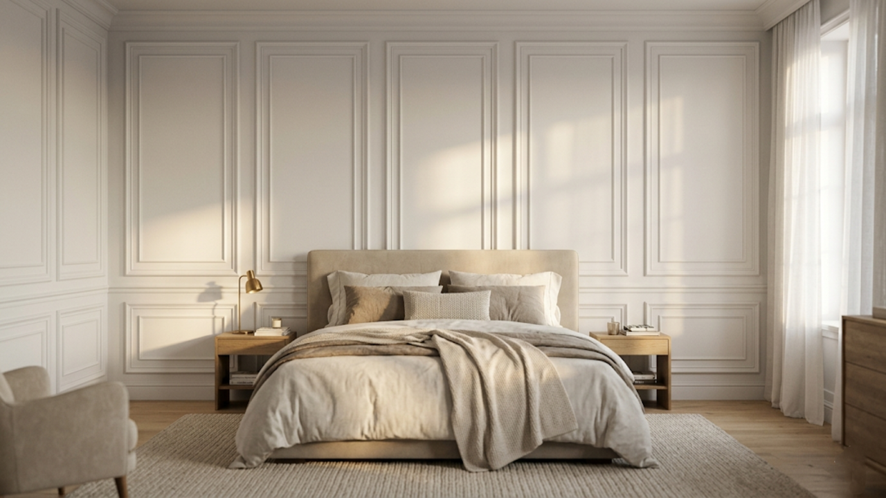 A pintura final é o passo que integra as molduras à parede, criando um visual monolítico e sofisticado no quarto. O uso da tinta látex acetinada é indicado por oferecer um brilho suave que destaca os relevos arquitetônicos.
