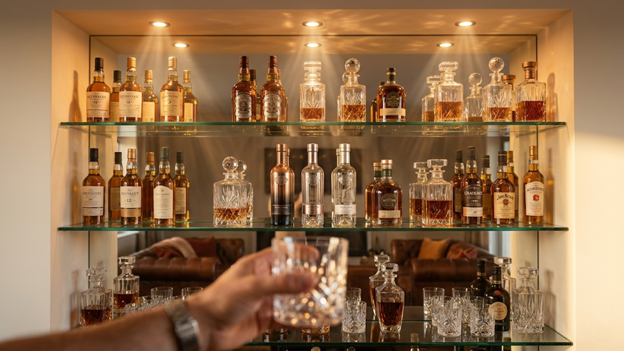 Colar um grande painel refletivo na parte traseira da sua marcenaria dobra imediatamente a percepção de volume do ambiente social. Esse truque ótico eficiente amplia cantos escuros e replica as cores dos rótulos importados, produzindo um belo efeito visual tridimensional e expansivo na sua sala.