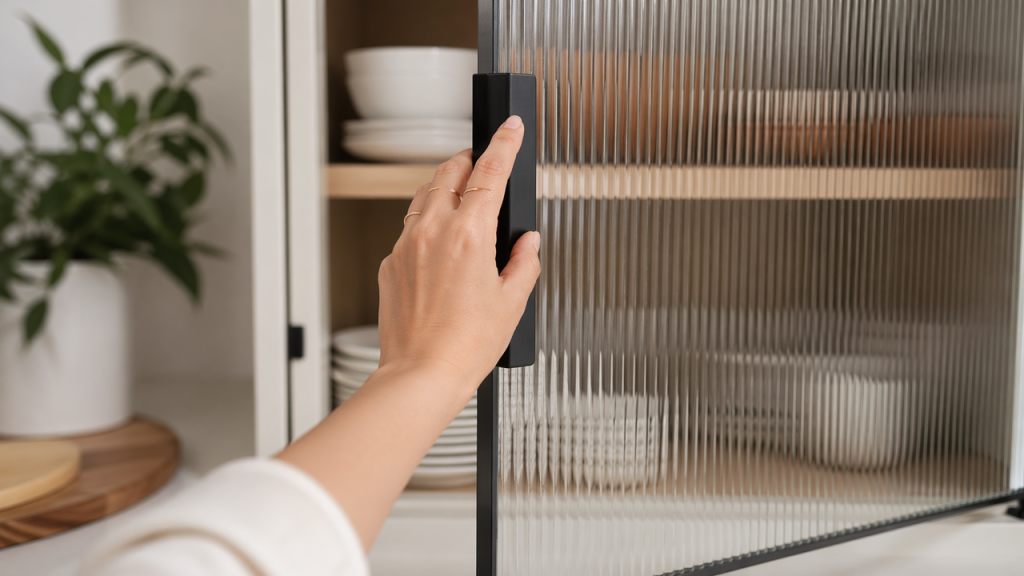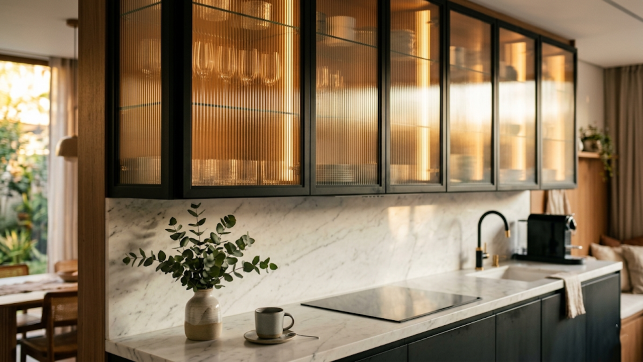A busca por portas de vidro canelado cresce aceleradamente entre quem deseja substituir a madeira pesada por um design leve e contemporâneo. Trocar as frentes dos armários traz transparência controlada, unindo perfeitamente a estética retrô ao perfil escuro atual para modernizar sua cozinha.