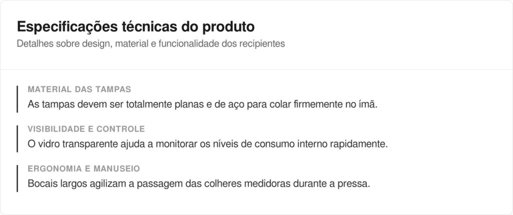 A estrutura da sua despensa aérea depende da escolha de recipientes leves, fáceis de higienizar e bem vedados. Frascos com volume entre 40 ml e 60 ml armazenam as medidas exatas para receitas semanais, custando entre R$ 30 e R$ 50 o lote de doze unidades.