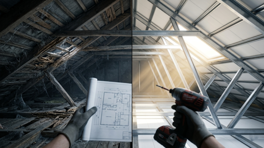 Os perfis metálicos pesam bem menos que a madeira maciça tradicional. Essa característica física alivia consideravelmente a carga de sustentação sobre as paredes e as fundações da casa. O manuseio simplificado das peças também acelera bastante o tempo total de execução da reforma.