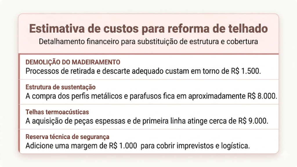 Realizar a substituição de cobertura residencial exige um planejamento financeiro minucioso para transformar a qualidade da sua moradia. Trocar o telhado de madeira infestado por cupins em uma área de 80 metros quadrados custa entre R$ 15.000 e R$ 25.000, somando perfis metálicos e telhas com isolamento.