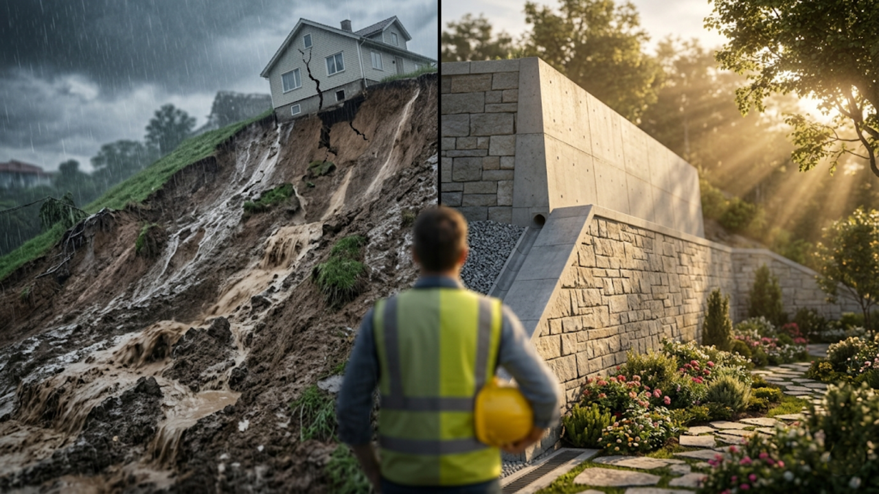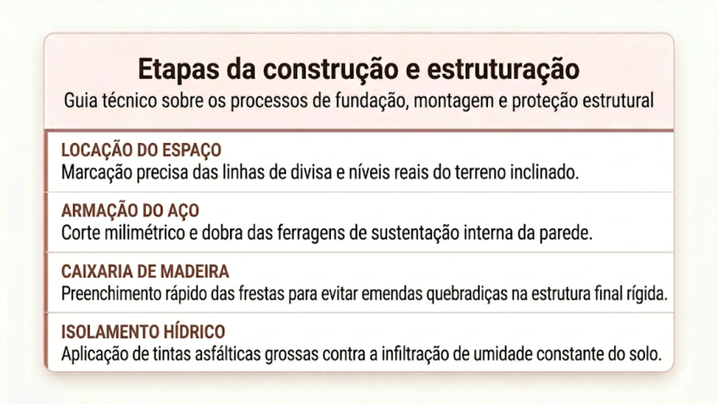 Projetos erguidos em declives acentuados demandam análises geológicas rigorosas antes que a primeira pá de terra seja movida. O responsável técnico calcula criteriosamente os empuxos ativos da encosta, garantindo que o paredão suporte as pressões máximas durante épocas de chuvas severas de verão.
