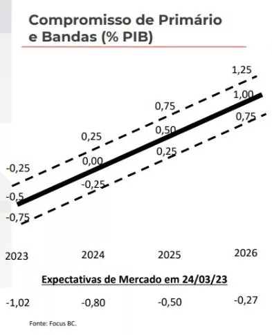 As expectativas de resultado primário ficaram em 0% para 2024, 0,5% para 2025 e 1% para 2026, enquanto o mercado prevê uma queda de 0,8%; 0,5% e 0,27%, respectivamente.