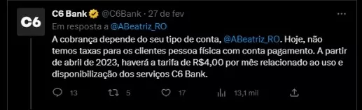 O C6 Bank começou a cobrar taxa de manutenção em contas de pagamento. Em resposta a uma usuária no Twitter, a fintech confirmou que agora é cobrado uma taxa de R$ 4 para manutenção nas contas desta categoria; em alguns casos há isenção do pagamento.