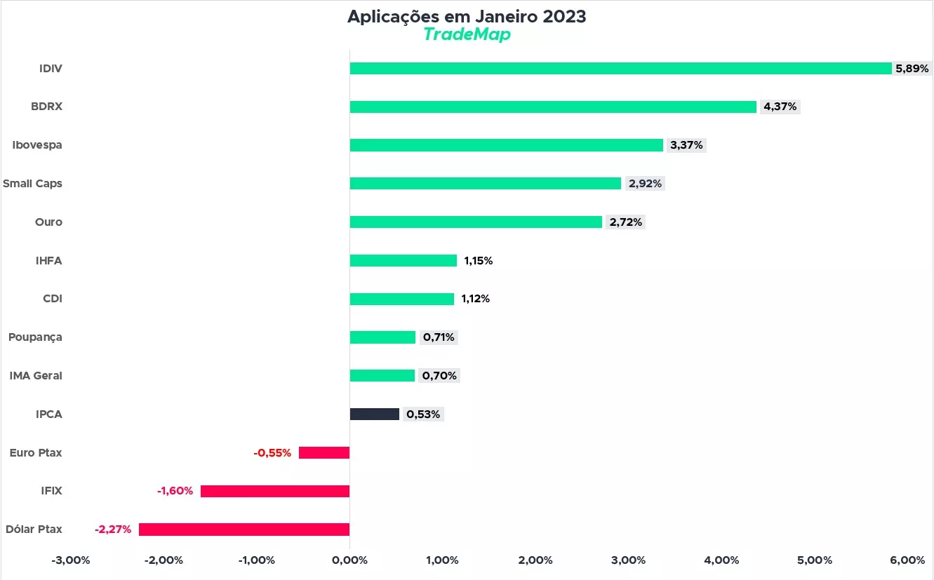 O índice de dividendos foi de 5,89% no mês de janeiro. O número é onze vezes maior que a inflação medida pelo IPCA, que ficou em 0,53%. Além disso, BDRs, Ibovespa e Small Caps também se destacaram entre as melhores aplicações no mesmo mês, segundo levantamento do TradeMap.