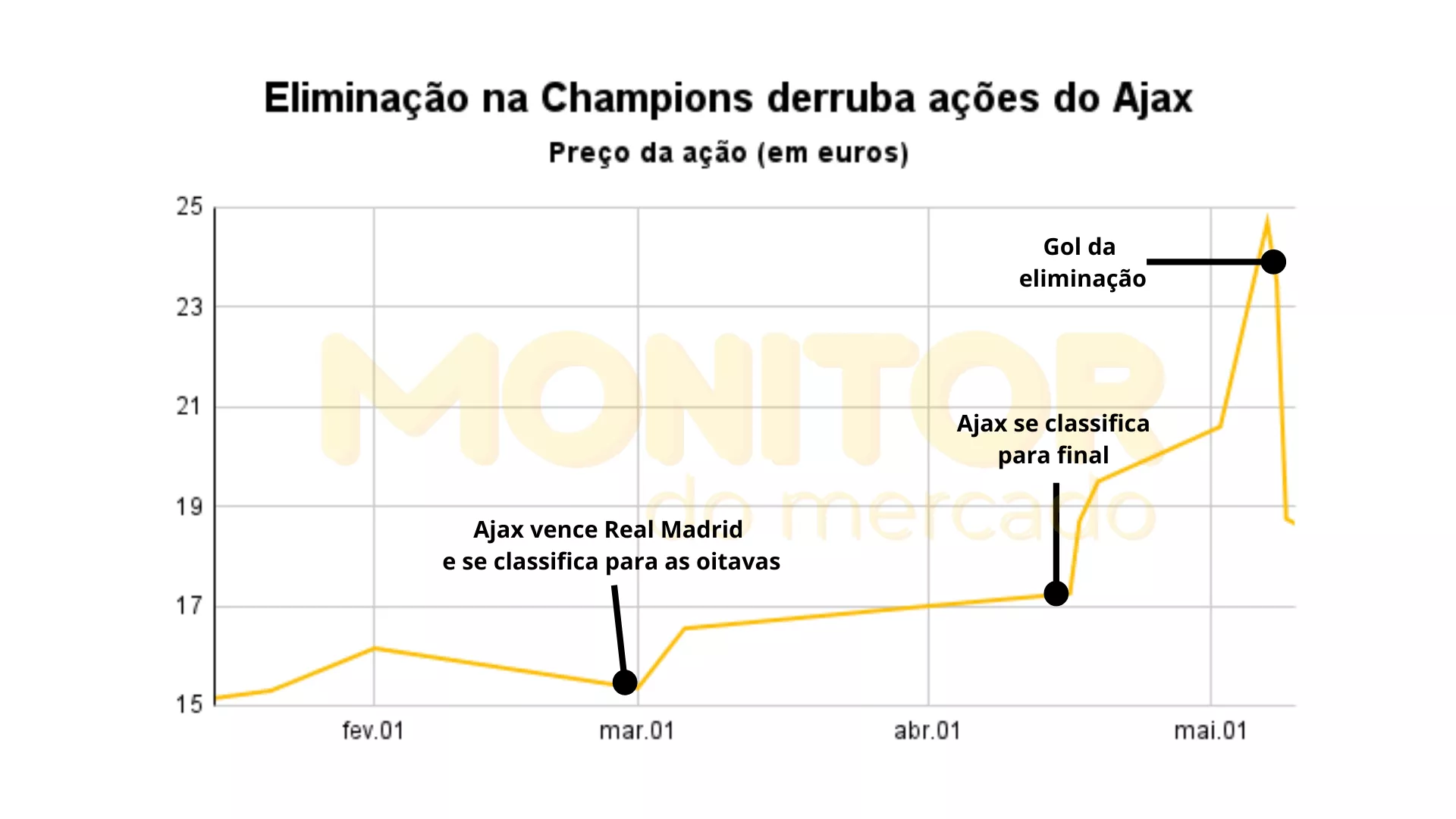 Em 2019, o Ajax, chegou à semifinal eliminando gigantes como Real Madrid e Juventus, na maior competição interclubes do mundo, a Champions League. Ao eliminar a equipe de Madrid, os holandeses viram uma valorização de 60% em suas ações. Porém, após a melancólica eliminação na semifinal, contra o Tottenham da Inglaterra, as ações desabaram mais de 20%.