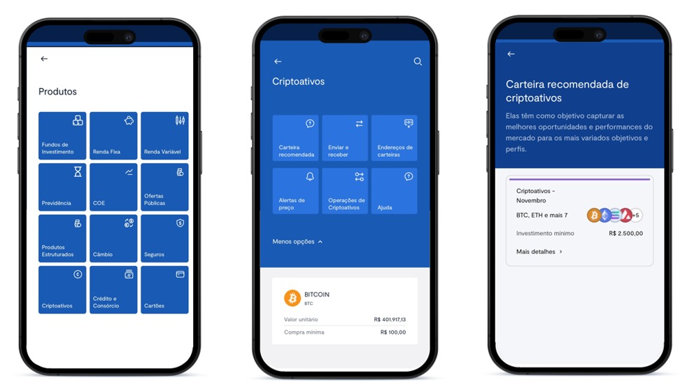 • Acesse o aplicativo do BTG Pactual e navegue até a seção de Criptoativos (Menu>Produtos>Criptoativos).