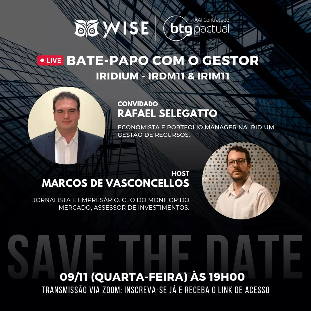 Em um evento online e gratuito, nesta quarta-feira (9), às 19h, Rafael Selegatto, gestor dos fundos imobiliários da Iridium, conversará com o CEO do Monitor do Mercado, Marcos de Vasconcellos, sobre as perspectivas para o setor dos FIIs no próximo ano.