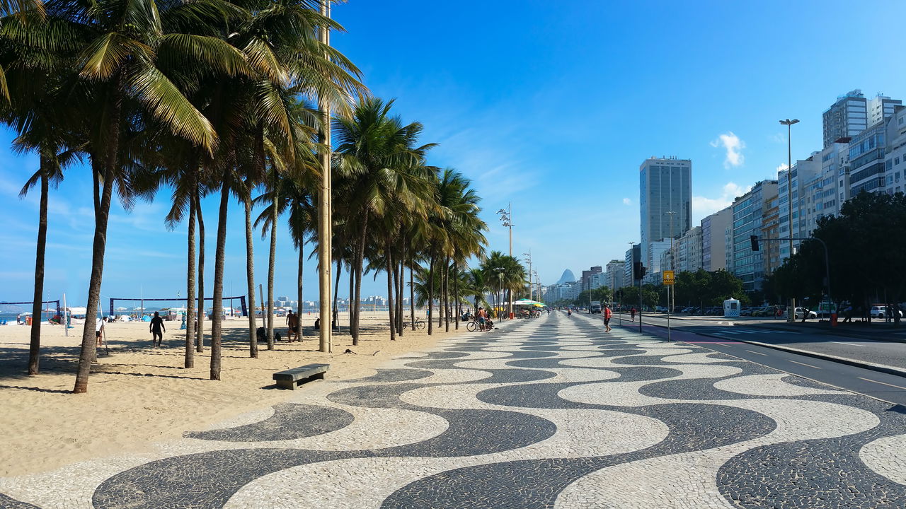 O calçadão de Copacabana é um dos aspectos mais icônicos da praia, conhecido mundialmente pelo seu design curvilíneo em ondas. Inspirado na Praça do Rossio, em Lisboa, Portugal, o calçadão foi criado em 1970 utilizando pedras portuguesas em preto e branco. Atualmente, ele serve como uma importante via para passeios e práticas esportivas, além de ser um ponto de observação da vida carioca.