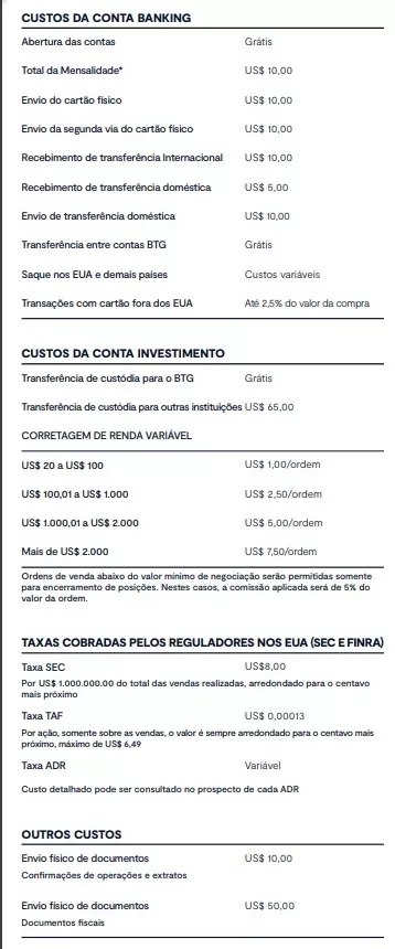 A abertura das contas é gratuita, e os clientes que já têm investimentos no banco podem obter isenção das taxas mensais, desde que tenham pelo menos R$ 50 mil ou US$ 10 mil investidos através do banco. Quem não atingir essa faixa, terá que desembolsar uma mensalidade de US$ 10. Veja a tabela com o total de custos por tipo de operação abaixo.