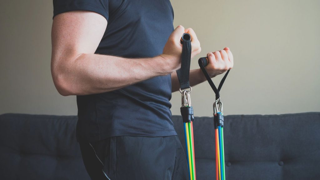 - Rosca Direta: Pise no elástico com os dois pés e puxe as pontas para cima, mantendo os cotovelos parados ao lado do corpo.