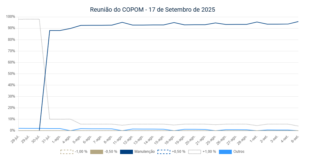 A decisão era esperada por quase todo o mercado. A última projeção do Índice Equus de Precificação da Selic (IEPS), feita no dia 8 de setembro, projetava uma chance de quase 96% de manutenção (veja no gráfico abaixo).