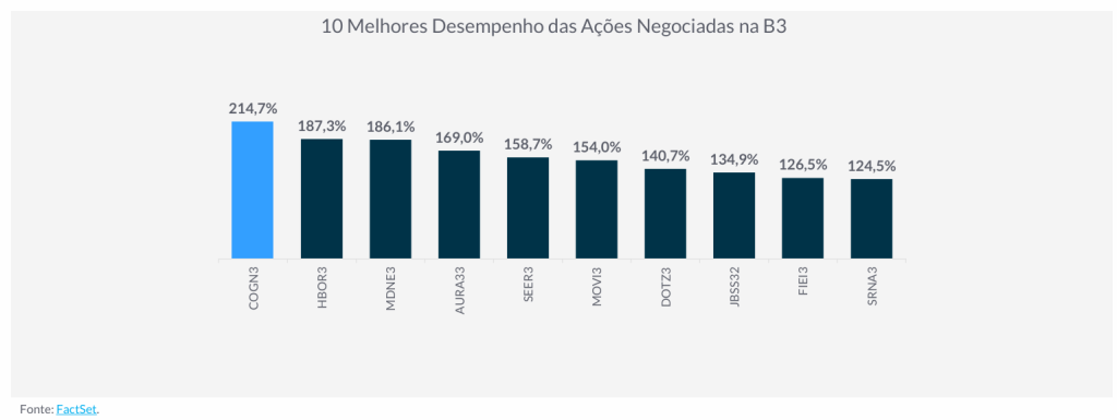 Considerando todos os índices da B3, a COGN3 está acompanhada de Helbor Empreendimentos (HBOR3) e Moura Dubeux (MDNE3) entre as três maiores altas.