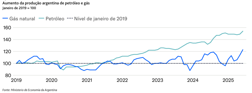 Na Argentina, o setor de petróleo e gás avança impulsionado por investimentos públicos e desregulamentação. A produção na formação de xisto de Vaca Muerta atingiu níveis recordes em 2025, com alta de 19% na produção de petróleo e 6% no gás em relação ao ano anterior.