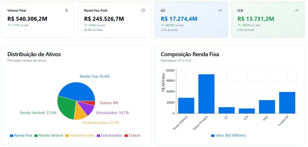 O desempenho do setor foi impulsionado pelos fundos de renda fixa, que captaram R$ 150,2 bilhões no período. Esses fundos investem em títulos de dívida emitidos por empresas e pelo governo, com retornos mais previsíveis e menor volatilidade em comparação com ações.