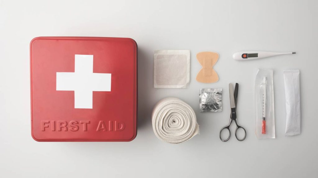 Um kit de primeiros socorros deve ter todos os itens essenciais para curativos, como gazes, esparadrapos e band-aids. Ter uma tesoura sem ponta e alfinetes de segurança também é recomendável.