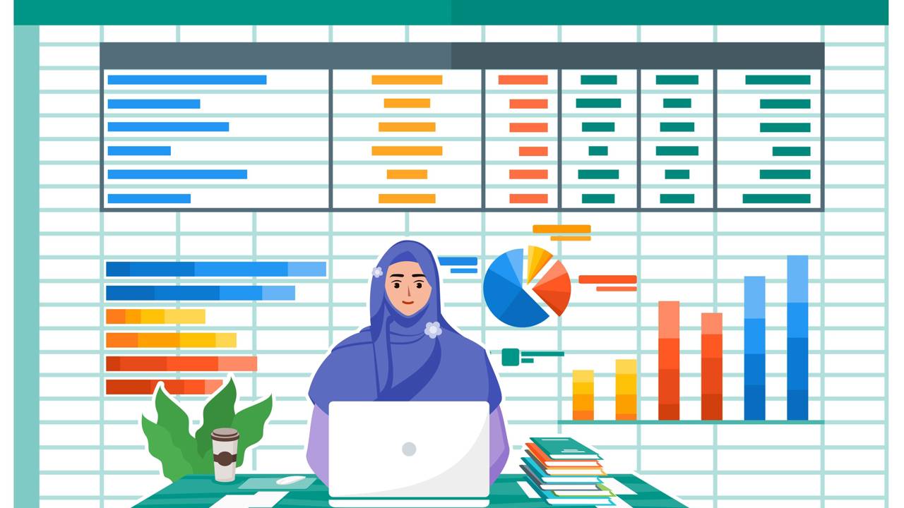 Ilustração de mulher usando um notebook com gráficos em volta - Créditos: depositphotos.com / MenaraGrafis
