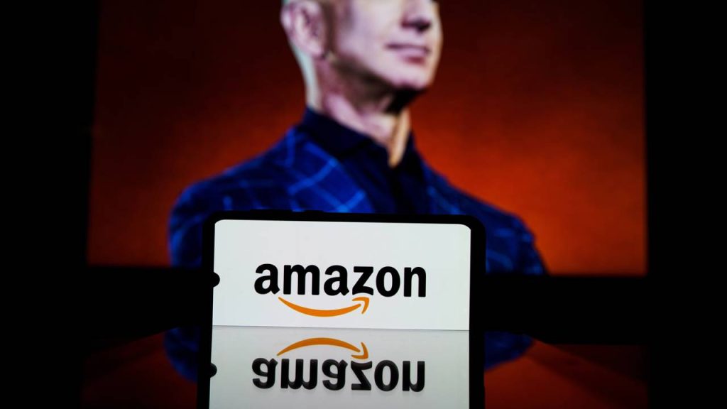 Jeff Bezos e um celular com a amazon – Créditos: depositphotos.com / rokas91